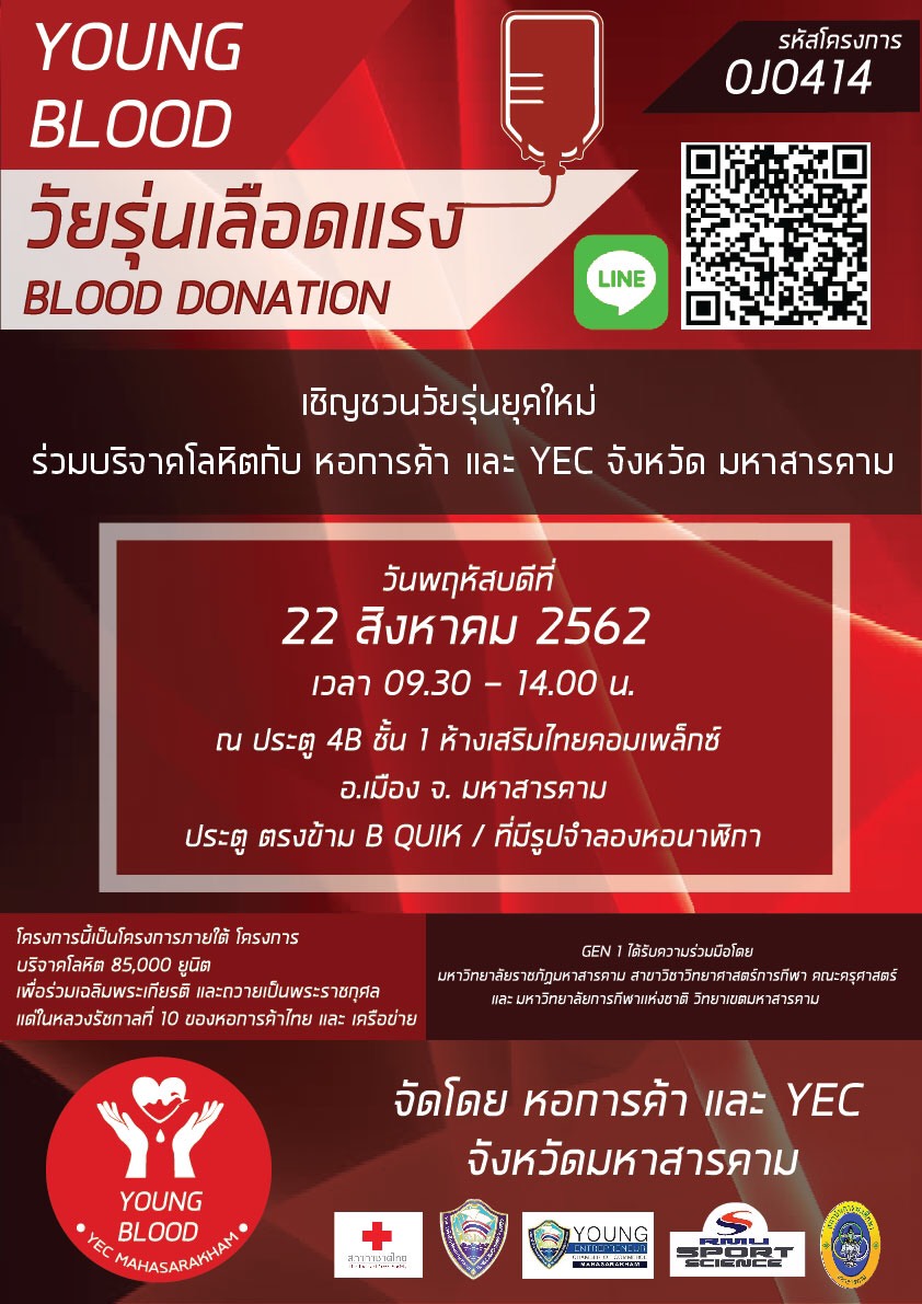 โดยขอเชิญร่วมบริจาคโลหิต ในวันพฤหัสบดีที่ 22 สิงหาคม 2562 นี้ ที่เสริมไทยคอมเพล็กซ์ (ตรงประตูรูปจำลองหอนาฬิกา)