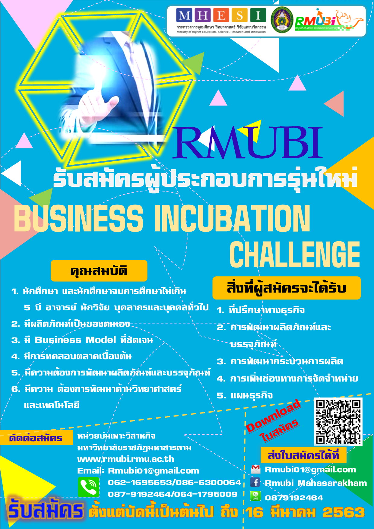 2) สมัครด้วยตนเอง ณ สำนักงานหน่วยบ่มเพาะวิสาหกิจ ชั้น 1 (อาคาร 34 )คณะวิทยาการจัดการ มหาวิทยาลัยราชภัฏมหาสารคาม รับสมัครตั้งแต่วันนี้ – 16 มีนาคม 2563